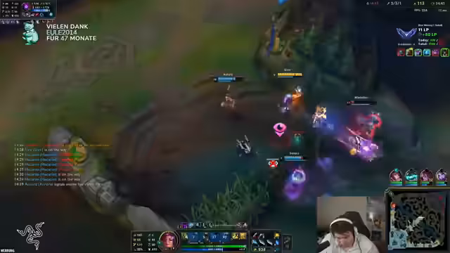 08:45:06Der Streamer beschäftigt sich intensiv mit der Champion-Meta der neuen Season. Er diskutiert die Stärken von Champions wie Zed (Bruiser-Version), Corki (moderater Damage) und Riven, die er als besonders stark und problematisch ansieht. Bei Riven kritisiert er, dass sie trotz hoher Pick-Rate und offensichtlicher Stärke von Riot nicht angepasst wird. Er analysiert Builds und spielt Items wie Lord Dominix auf Corki und Lord Dominix auf seinen TF. Die Games werden als chaotisch und schnell beschrieben, wobei er davon ausgeht, dass sich die Meta nach Balance-Changes noch einpendeln wird.