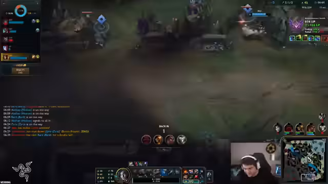 07:10:12Das Gameplay konzentriert sich auf den Jungler, der trotz eines Verlustes im 010-Panisch-Spiel weiter farmt, um stark zu werden. Es wird eine strategische Entscheidung getroffen, defensive Pilze zu legen und einen Drachen zu versuchen, um die Moral zu erhöhen, obwohl die gegnerische Seite bereits viele Vorteile erlangt hat.