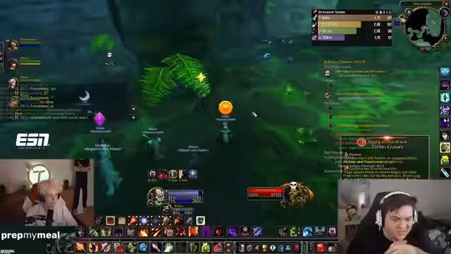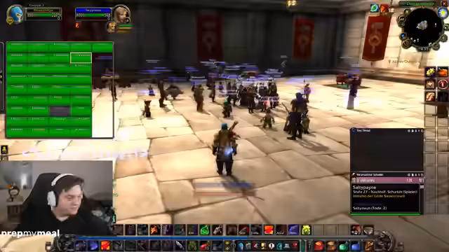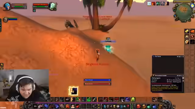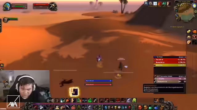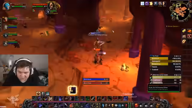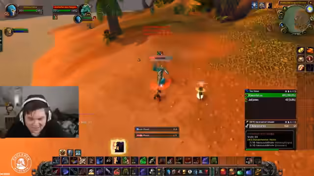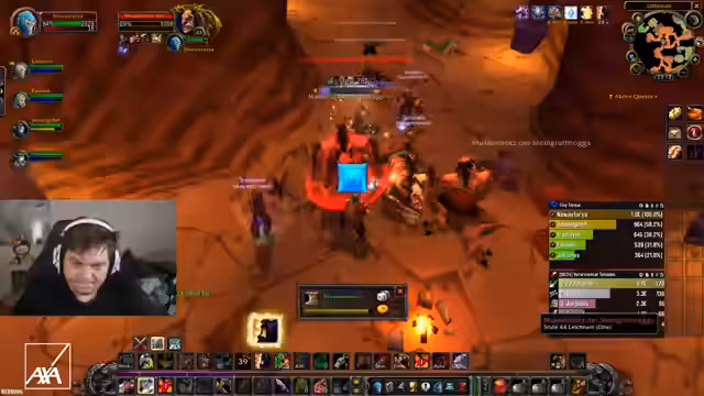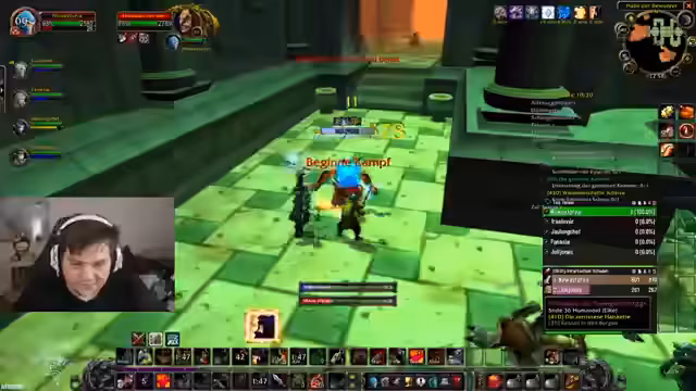 08:27:33Die Gruppe erkundet einen Dungeon, wobei der Fokus auf der Koordination beim Pullen von Gegnern und der Bewältigung von Bosskämpfen liegt. Der Spieler nutzt aggressive Fähigkeiten wie Agro und Mortal Strike, während die Gruppe darauf achtet, Line of Sight Mechaniken zu nutzen und Gegner in der richtigen Reihenfolge zu fokussieren. Die Bosskämpfe erfordern präzises Timing von Crowd Control und den Einsatz von Cooldowns, um den Schaden zu managen und die Aggro zu kontrollieren, insbesondere da der Streamer unterlevelt ist und daher viel Schaden erhält.