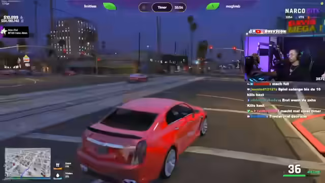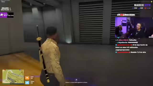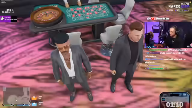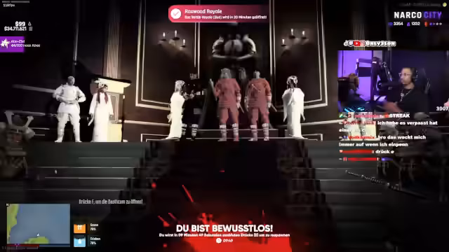00:09:02Im Stream eskaliert eine fiktive Erpressung gegenüber einem Spieler namens Sana. Es wird eine Razzia angedroht, sollte Sana nicht bis 21:35 Uhr eine geforderte Menge an ADV, Rap Kids und Westen auszahlen. Der Streamer argumentiert, es gehe nicht um das Geld, sondern um eine Botschaft, und fordert Sana auf, die Bedrohung ernst zu nehmen. Es werden Personenschützer und der mögliche Verlust von Freunden und Casinos als Druckmittel erwähnt.