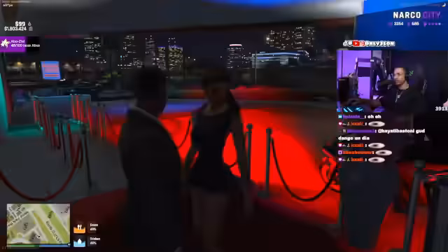 01:15:10Die Szene beginnt mit einem fiktiven Polizeieinsatz, bei dem ein Beamter eine Frau für einen Außen-Einsatz fordert. Im Anschluss identifiziert sich der Streamer selbst als der fiktive Boss 'Riz Master' und betont seine Autorität. Es folgen kurze Interaktionen, unter anderem mit 'Mowgli', dem ein neuer Anzug verpasst wird und dem ein Platz in der 'Big Chilling'-Familie angeboten wird. Der Abschnitt endet mit einem verpassten Anruf und einem Treffpunkt am Polizeirevier.