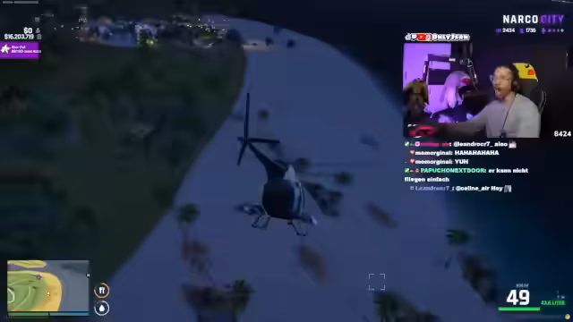 01:22:13Die Szene wechselt zu einem militärischen Einsatz auf der Insel Galapagos. Eine Armee-Einheit attackiert dort Lager von Terroristen, wie Jigsaw und Lars Röfe. Es gibt Luftunterstützung durch einen Hubschrauber, der an der Mission teilnimmt. Der Streamer agiert als Pilot und schießt Raketen, doch der Einsatz wird als chaotisch beschrieben und endet mit einem Absturz.