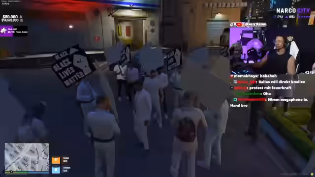 01:05:03Nach der Konfrontation mit dem DOJ mobilisiert der Streamer seine Anhänger für eine geplante Demonstration. Er benötigt mindestens 40 bis 50 Personen und spricht verschiedene Gruppen an, darunter Taxifahrer und Mitarbeiter aus dem Human Labs. Das Motiv der Demo ist der Protest gegen das DOJ und die Unterstützung seiner Rechte. Er kündigt auch an, die Weasel News für eine öffentliche Präsentation seiner Meinung kontaktieren zu wollen.
