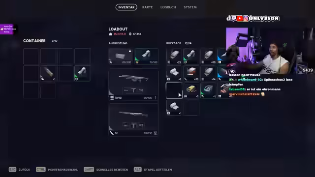 09:39:57Die Gruppe konzentriert sich auf das Finden von wertvollem Loot in sogenannten „Spinns“, die oft seltene Gegenstände enthalten. Besonders hervorgehoben werden Items mit einem Diamantzeichen, die zum Verkaufen gedacht sind, um Geld für den Schwarzmarkt zu erhalten. Ein Spieler findet ein „Lances Midstable, 5. Auflage“, das 10.000 Ingame-Währung wert ist und als „episch“ beschrieben wird. Ein „Unterhalsband“ wird gefunden, das zum Hochleveln eines Pets dient. Es wird auch über das Inventar und das Gewicht der Items gesprochen, wobei ein Spieler einen Warenwert von 39.000 Ingame-Währung in seinem Inventar hat. Die Wichtigkeit, auf das Gewicht zu achten, um im Kampf agil zu bleiben, wird betont. Außerdem wird ein Atemgerät als Maske gefunden, was auf bevorstehende Kämpfe oder Umweltgefahren hindeutet.