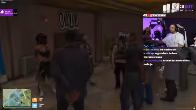 07:22:40Nach einer längeren Phase der Interaktion mit der Community startet eine Paintball-Runde gegen die Charaktere Bella und Mowgli. Es wird intensiv über die Waffenauswahl und die Regeln diskutiert. Das Spiel ist geprägt von technischen Problemen, Ego-Kämpfen und gegenseitigen Vorwürfen über Betrug und Glitches. Am Ende sagt Diamond, Bella habe in Narko City gewonnen, er sei aber in anderen Disziplinen besser, was den fortwährenden Wettkampf und die ständige Argumentierfreudigkeit zwischen den Charakteren unterstreicht.