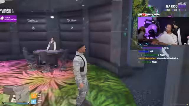 05:13:38Zwischen den Aktionen wird viel Zeit für interne Abstimmungen und Streitigkeiten aufgewendet. Der Croupie klärt mit seinen Teammitgliedern die Hausordnung, insbesondere die korrekte Platzierung von Geräten wie dem Heli. Parallel dazu wird eine spontane Wette für ein Duelle zwischen den Zuhörern ausgehandelt, bei der es um den Einsatz von Subs geht. Wichtigster Tagesordnungspunkt ist jedoch das Verhältnis zur Schwester, das vom Croupie als extrem angespannt und belastend beschrieben wird, was sich später in einer Dringlichkeit für eine Therapiesitzung äußert.