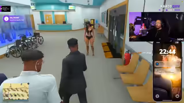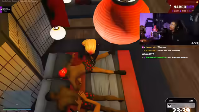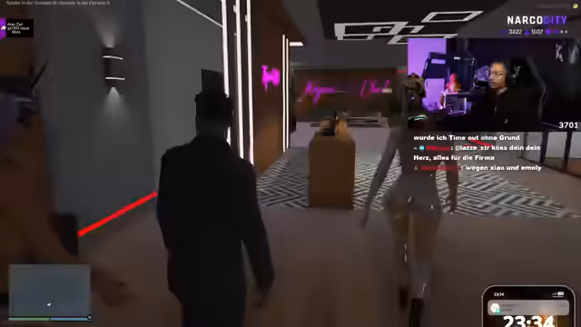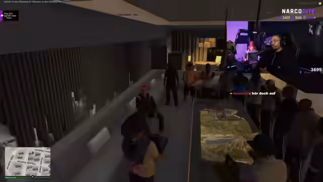 04:01:01Der Stream zeigt eine Simulations-Szene einer Razzia in einem Casino. Ein Mann, der angeblich Diamond's Freund ist, wird als Geisel genommen. 'Diamond' fordert einen respektvollen Umgang, andernweise bleibe der Geisel gefangen. Die Szene mündet in einen handfesten Konflikt, bei dem der Geisel Prinz wegen mangelnden Respekts in Schwierigkeiten gerät. Nach einer kurzen Machtdemonstration, bei der Diamond eine waffe zieht, wird die Situation kurz entschärft.