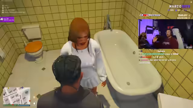 02:13:37Im Rahmen des Rollenspiels betreten Streamer und Melissa (als 'Stepmom Veronika') das Spiral Hotel. Streamer agiert als exzentrischer Gast 'Mr. Diamond', der ein Zimmer mit extra Features wie einem Basketballkorb und Didiplus-Paket anfordert. Die Hotelmanagerin spielt mit und bietet 'Goodie-Körbchen' mit Babyöl an. Das interaktive Szenario beinhaltet humorvolle und suggestive Dialoge über Zimmerreservierungen, lautstarke Aktivitäten und unkonventionelle Serviceleistungen.
