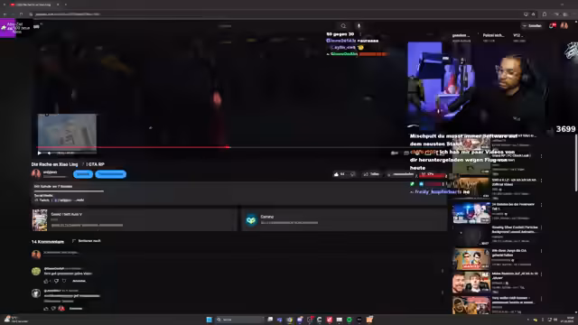 04:03:52Ab Zeitstempel 14632 treten schwere technische Probleme auf: Der PC und das Mischpult versagen, was zu einer Unterbrechung führt. Der Streamer reagiert frustriert, während der Chat die Störungen kommentiert. Nach der Wiederherstellung wird weiter interagiert, wie Likes und Kommentare für den Stream bewertet werden, bevor der Stream fortgesetzt wird.