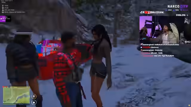 00:33:51Ein Rollenspiel-Szenario beginnt, in dem der Streamer ein Date mit einer Figur namens Karma plant. Er sucht nach einem Schneemobil für das Treffen und bittet den Admin Ivan um Hilfe beim Spawnen des Fahrzeugs. Bei dem Date kommt es zu ungewöhnlichen Entwicklungen: Karma wird von einer mysteriösen Gruppe verfolgt, die sie als Hexen bezeichnet. Der Streamer bietet ihr Drogen an, die für 250.000 pro Spritzer verkauft werden, und spekuliert über die Vor- und Nachteile einer Beziehung mit einem Vampir.