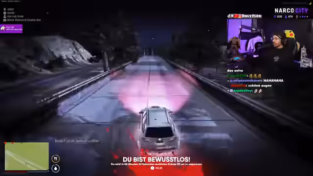 05:15:06Der Streamer und sein Team verfolgen ein Fahrzeug der Gang 'Barrio La Sombra', das sie seit drei Stunden begleitet. Nach einem Schusswechsel und einer Verfolgungsjagd versuchen sie, einen Gegner zu überwältigen, scheitern aber, als dieser entkommt. Sie diskutieren die Macht der Gang und diskutieren, ob sie zum Medic fliehen oder nach Palito zurückkehren. Dabei kommt es zu weiteren Begegnungen mit Fahrzeugen der Gang, die in einer hektischen Verfolgung gipfeln, bei der versucht wird, einen Gegner aus seinem Fahrzeug zu holen.