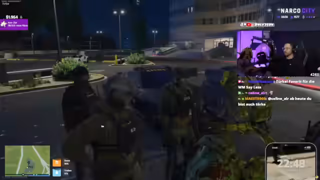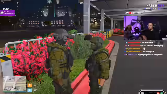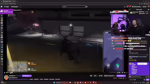 03:24:01Das Streamer-Team führt einen geplanten Einsatz durch, um Raik festzunehmen. Raik wurde zu einem Gespräch gelockt und mit dem Codewort 'Praline' gestürmt. Er wird gefesselt und als Geisel abtransportiert. Der Vorgang wird koordiniert und es wird sichergestellt, dass alle fliehen können. Es herrscht ein militärischer und zielgerichteter Ton bei der Durchführung des Einsatzes.