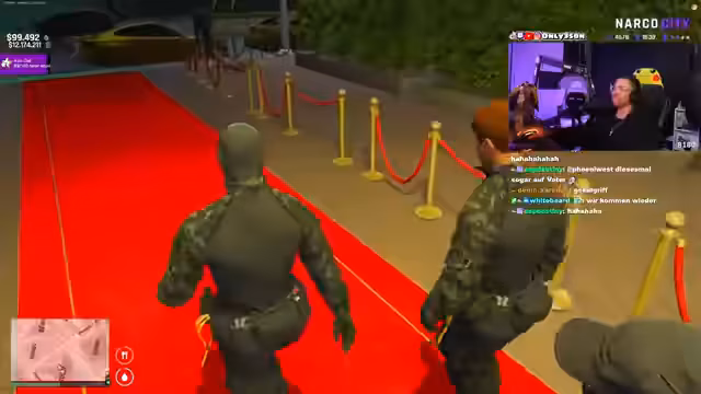 00:42:55Nachdem sich der private Streit beruhigt hat, wechselt der Streamer das Thema. Er plant eine Mission mit seinem Team gegen einen Rivalen namens McAllister. Dafür treffen sie sich auf einem Militärflugplatz, wo der Streamer, als "General", seine Schwester Melissa anwirbt, sich der US Army anzuschließen. Melissa ist zunächst skeptisch und will lieber als Ranger arbeiten, was der Streamer jedoch ablehnt. Es wird eine zukünftige Grundausbildung für sie angesetzt und der Streamer stellt klar, dass er sie zur Arbeit zwingen wird.