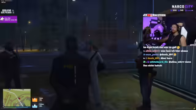 05:20:14Nachdem der Streit um den Funk beigelegt ist, sprechen die Streamer über das aktuelle Fußballgeschehen und äußern ihre Freude über den Sieg von Bayern Real mit 2-1. Der Streamer schwärmt von der goldenen Ära des FC Barcelona mit Spielern wie Messi, Iniesta und Xavi Alonso. Im Anschluss daran wird eine Verkehrskontrolle durchgeführt, bei der ein Verdächtiger namens Julian Guzman festgenommen wird, nachdem dieser Kokainpflanzen gesammelt haben soll. Es beginnt ein Verhör, um die Zugehörigkeit zu einer Familie und deren Aufenthaltsort herauszufinden.