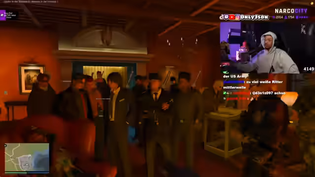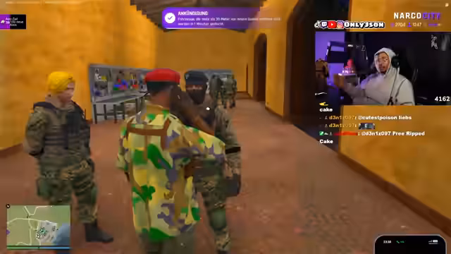 01:02:07Der Streamer zieht sich mit der asiatischen Botschaft in sein Büro zurück, um die Verhandlungen zu führen. Es wird festgestellt, dass er keinen Zugriff auf das Bossmenü hat, obwohl er den 12er-Rang besitzt, was auf einen technischen Fehler hindeutet. Währenddessen wird über die Möglichkeit gesprochen, dass Bella, die Ex-Frau des Streamers, der Armee beitreten möchte, was jedoch ohne Bevorzugung geschehen müsste. Die Verhandlungen mit der asiatischen Botschaft beginnen, wobei der Streamer die gemeinsamen Ambitionen gegen die „verfluchte Elite“ und die BV141-Einheit betont. Es werden Ressourcen wie Huren, Holz, Lebensmittel und amerikanisches Öl gefordert. Plötzlich wird die Gruppe von der US-Army angegriffen, was zu Chaos und dem Befehl führt, sich zu verteidigen und Kettenfahrzeuge auszuparken. Die Situation eskaliert schnell zu einer vollwertigen Schlacht, und es wird festgestellt, dass dies eine Kampfansage war.