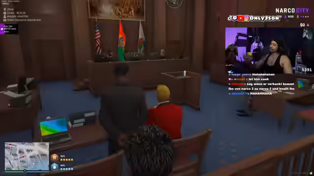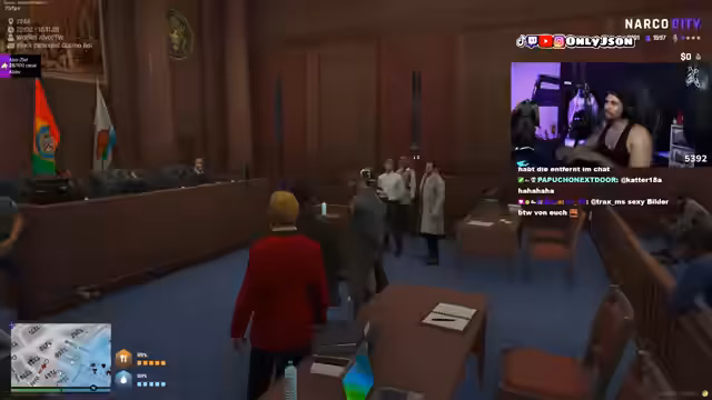 00:42:17Der Streamer und sein Team finden sich in einer Gerichtsverhandlung wieder, in der es um ein getötetes Pferd und einen Schadensersatzanspruch der russischen Mafia geht. Flair fungiert als Verteidiger und muss sich mit den Richtern auseinandersetzen, die auch Haustiere wie Eichhörnchen im Gerichtssaal dulden. Die Anklagepunkte umfassen Verstoß gegen den Verhältnismäßigkeitsgrundsatz, Körperverstümmelung und die Zerstörung des Anwesens. Diamond fordert einen Schadensersatz von mindestens 3 Millionen Dollar wegen Rufmord und betont, dass er unschuldig sei. Die Verhandlung wird hitzig, und es kommt zu humorvollen Einlagen, wie der Forderung nach 10 Ordnungsliegestützen für störendes Verhalten. Die Verteidigung argumentiert, dass der Einsatz der Ranger verhältnismäßig war, da das Anwesen von vielen Personen bewohnt sei und die Beamten in Unterzahl waren.
