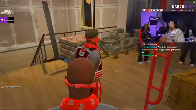01:10:18Zu Beginn des Stream-Ausschnitts schildert die Person eine unangenehme Situation nach dem Aufwachen und die Suche nach einer verschwundenen Unterhose. Kurz darauf eskaliert die Szene dramatisch, als die Person in einem Konflikt mit einer Gruppe, den 9-1-Dogs, landet. Aus Verwirrung über die Farbcodierung und die Identität der Gruppe, trug sie fälschlicherweise rote Kleidung. Die Situation spitzt sich zu, als sie von den Mitgliedern der Gruppe festgehalten und durchsucht wird, wobei sie bewaffnet zu sein vorgibt, aber versichert, die Waffen nicht einzusetzen.