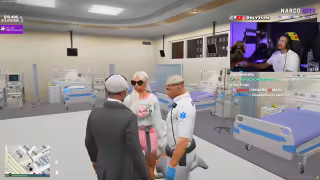 00:53:17Die Situation eskaliert, als das Hotel, in dem sich der Streamer befindet, von einer bewaffneten Einheit umstellt wird. Er sitzt in einem Raum mit Sprengstoff (C4) und versucht, die Lage zu kontrollieren. Sein Vater, Mr. Wallace McAllister, wird als verletzt und blutend am Boden liegend erwähnt. Ein Gespräch mit dem Anführer der Belagerer beginnt, bei dem der Streamer eine Verhandlung aushandeln will und sogar eine Medizinerin ins Hotel lässt, um seinen Vater zu versorgen, um Zeit zu gewinnen.