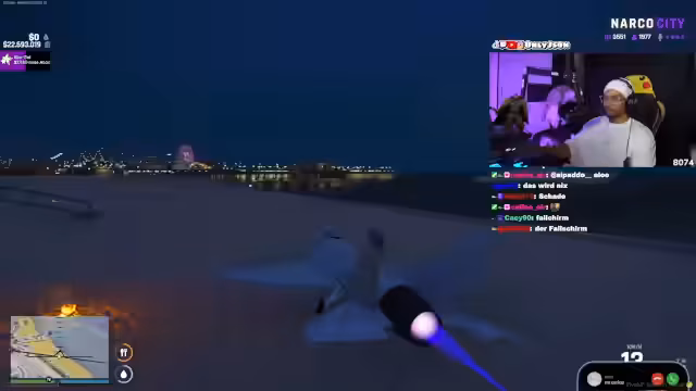 00:43:50Der Streamer ist erfolgreich auf der Insel infiltriert und trifft auf sein Team. Es kommt jedoch zu einem Konflikt, als ein 'Juan' als Heli-Schütze ohne GPS identifiziert wird. Dieser wird verdächtigt, ein Spion zu sein. Es kommt zu einer hitzigen Auseinandersetzung, 'Juan' wird gefesselt und als Gefangener abtransportiert. Der Streamer selbst gerät in eine lebensgefährliche Situation und strandet im offenen Meer.