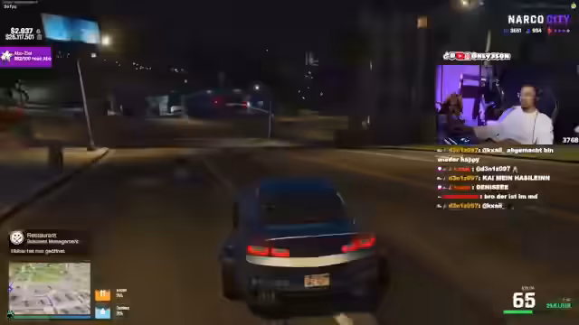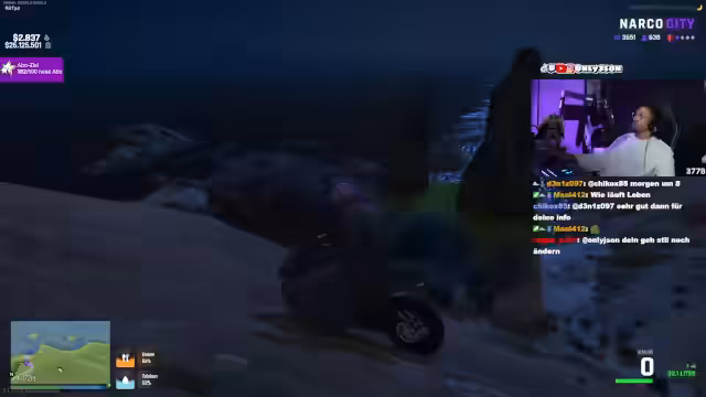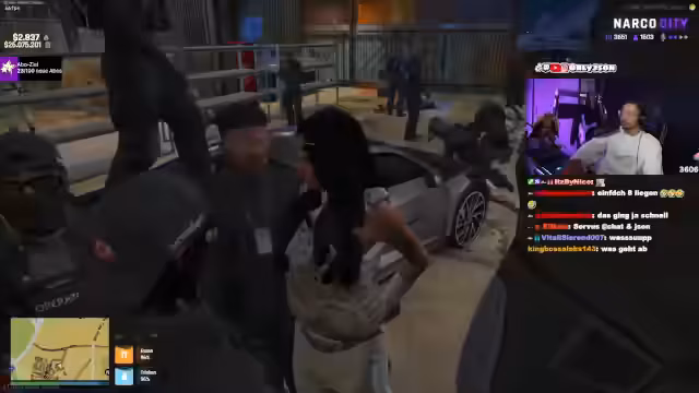 01:00:36Der Streamer bereitet sich auf einen Einsatz vor, bei dem er sich von einem vermeintlichen Zivilisten fesseln lassen will. Es kommt zu einer kurzen Verwirrung, als der Zivilist aufgrund seiner Kleidung und seines Aussehens fälschlicherweise für Ernesto, ein Mitglied der Caravelli-Familie, gehalten wird. Nachdem die Identität geklärt ist, dass es sich um einen ehemaligen Pediler handelt, fahren die beiden in Kolonne zu einem Treffpunkt. Der Streamer erwähnt, dass er drei Smartphones und zwei GPS-Tracker bei sich trägt, um seinen Standort zu sichern.