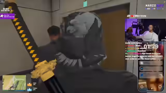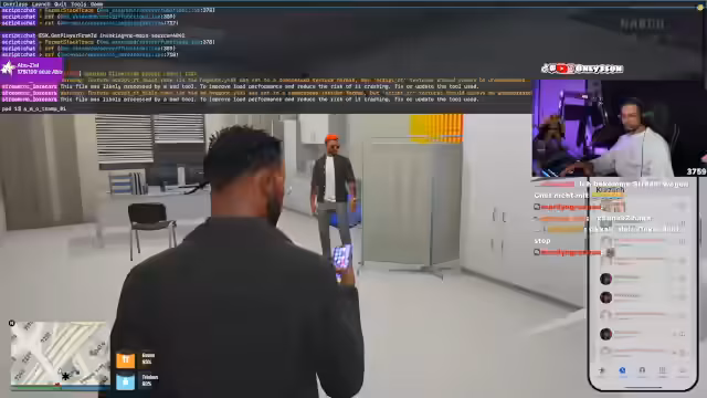 03:52:02Der Streamer und ein Freund namens Melissa suchen in einem Club nach einem Charakter namens Xiao, der sie angeblich verfolgt und verunsichert hat. Als sie ihn finden, kommt es sofort zu einer Konfrontation. Ein Charakter, möglicherweise Chuck, erscheint und hält Xiao mit einer Waffe in Schach. Es kommt zu verbalen Tausch und Drohungen, als Xiao zurückschlägt und den anderen als 'Köter' bezeichnet und andeutet, dass seine Leute ihn schon suchen. Die Situation eskaliert und Xiao droht, ihm das Gesicht zu 'wechsen'.