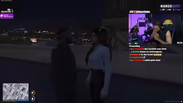 07:01:39Nach der ersten Konfrontation mit dem anonymen Anrufer flieht der Streamer mit Victoria in einem Fahrzeug. Die Situation eskaliert, als sie von der Polizei gestoppt werden. Ein Officer konfrontiert die beiden, verlangt Ausweise und bemerkt komische Geräusche aus dem Kofferraum, was den Spannungsbogen weiter erhöht. Obwohl der Streamer versucht, die Situation zu beruhigen und Victorias Unschuld zu beteuern, bleibt die Atmosphäre extrem angespannt und ungewiss.
