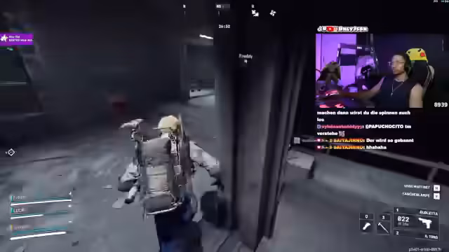 08:26:33Ein heftiger Kampf ereignet sich, bei dem der Streamer als Köder fungiert, um Gegner in eine Falle zu locken. Es kommt zu mehreren Auseinandersetzungen in einem Gebäudekomplex, wobei Gegner aus verschiedenen Richtungen attackieren. Der Streamer koordiniert sein Team, um überraschende Angriffe zu starten, während er gleichzeitig auf den Feind von hinten aufpasst und strategisch Positionen wechselt, um den Gegner zu überrumpeln.