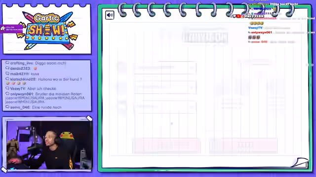 02:55:42Der Streamer startet ein interaktives Zeichenspiel namens 'Gartick Show', bei dem Zuschauer erraten müssen, was er zeichnet. Es werden drei Runden angekündigt, wobei der Gewinner jeder Runde 20 Euro PayPal erhält. Die Teilnahme ist für den Chat aktiv, der aufgefordert wird, zu spammen. Nach mehreren Runden wird ein Gewinner namens Maik42111 ausgelost, der einen Preis erhält. Das Spiel wird als unterhaltsame Kunstperformance beschrieben, bei der der Streamer seine zeichnerischen Fähigkeiten präsentiert und die Zuschauer einbindet, bevor er zurück zum Rollenspiel wechselt.