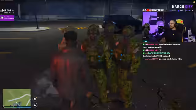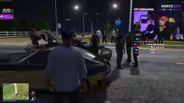 03:15:09Nach dem Spiel setzt der Streamer das Rollenspiel fort und diskutiert einen Verrat durch einen Charakter namens Hunter, der als Snitch fungiert. Der Streamer hat Screenshot-Beweise, dass Hunter die Position der Gruppe an eine Feindfamilie verraten hat. Es folgen Pläne, Hunter zur Rechenschaft zu ziehen, einschließlich eines geplanten Überfalls auf dessen Position. Die Interaktion zeigt eine Konfliktsituation mit anderen RP-Charakteren, die als spannendes Element der Geschichte dargestellt wird.