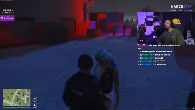 02:04:55Ein Streit mit einem anderen Charakter namens Hill (oder Hallemann) bricht aus, weil dieser das Auto des Streamers beschädigt haben soll. Es folgt eine verbale Auseinandersetzung mit rassistischen Untertönen und Drohungen. Parallel dazu verhandelt der Streamer mit Svetlana über Unterhalt und Kindergeld, beschimpft sie und droht mit einer Sorgerechtsklage, da er die elterliche Fürsorge für Melissa für unzureichend hält.