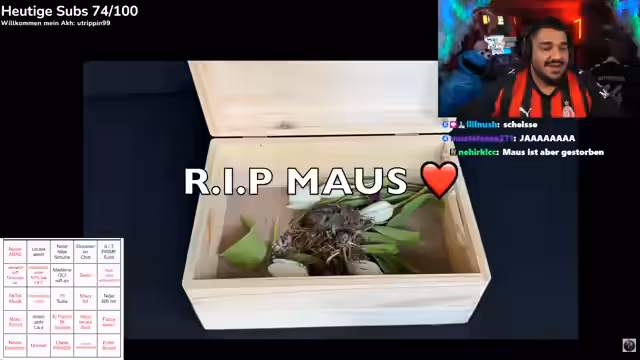 02:55:51Die Stimmung schlägt um, als eine Maus im Auto des Streamers gefunden wird, die laut Mechanikern bereits sterbenskrank ist. Nach einem gescheiterten Versuch, sie am Flughafen freizulassen, und einer emotionellen Abschiedsrede begleitet das Team die Maus auf ihren letzten Weg. Eine tieftraurige Beerdigung im Garten folgt, bei der die Kinder getäuscht werden, indem die Maus nur eingeschlafen sei. Der Streamer verarbeitet den Vorfall mit Trauer und einer anrührenden Ansprache über das Abschiednehmen.