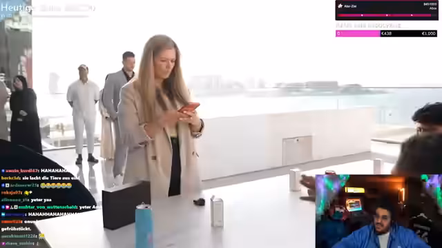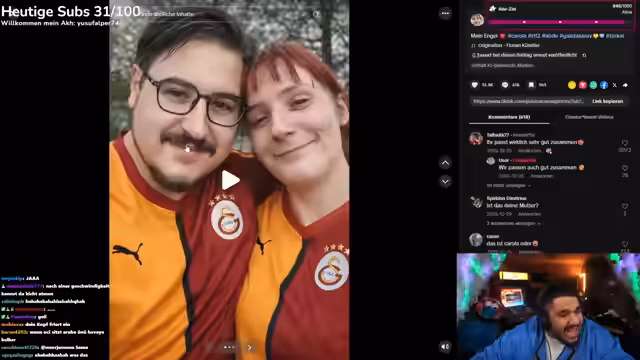 01:13:48Ein neues Video des Kanals Nahem Sky mit dem Titel "Erkenne die Paare" wird angekündigt, das im Rahmen eines Auslandsspecials in Dubai gedreht wird. Der Streamer plant ein Ratespiel, bei dem er reale Pärchen von Arbeitskollegen oder vorgetäuschten Paaren unterscheiden muss. Er startet eine Vorhersage, da er unsicher ist, wie viele Pärchen teilnehmen und wie er damit umgehen soll. Die erste Runde des Spiels beginnt mit der ersten Vorstellung eines Paares.