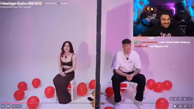 02:26:22Der Streamer stellt ein Blind-Date-Format vor, das in einem professionellen Filmstudio aufgenommen wurde. Die erste Teilnehmerin namens Alicia stellt sich als 25-jährige Tänzerin aus Ludwigshafen vor, die unter anderem Pole Dance und Kampfsport betreibt. Ihr Gegenüber Kai, 27 Jahre alt aus Stuttgart, arbeitet im Social-Media-Bereich. Die Anfangsphase des Dates ist durch höfliche, aber oberflächliche Gespräche geprägt, wobei beide versuchen, sich gegenseitig durch Fragen kennenzulernen.