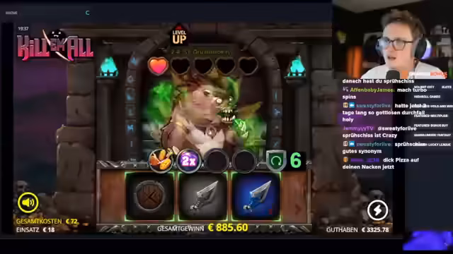 01:52:54Der Gewinner wird über Instagram kontaktiert, und praktische Anweisungen für die Einlösung des Gutscheins gegeben. Parallel dazu bereitet sich der Streamer auf die nächste Risk-Phase vor, indem er das Spiel Kill'em All auswählt und dessen Mechanik (Schwerter, Mobs, Perks) erklärt, um langfristig durch hohen Einsatz bis zum Boss zu kommen.