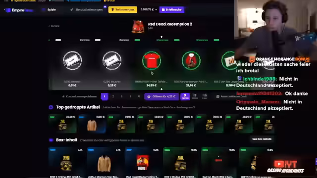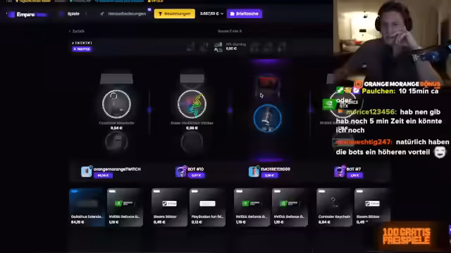 02:07:49Die Session mit dem Spiel 'Beef' wird beendet, und der Streamer drückt seinen Ärger über verpasste Gewinne aus, obwohl bereits 100.000 Euro Profit gemacht wurden. Er erwähnt, dass er die 15.000 Euro hätte mitnehmen können und dass die 'Bullets' für die kommenden Tage bereits verzockt wurden. Trotzdem betont er, dass es eigentlich egal sei, da bereits ein guter Profit erzielt wurde. Er bewirbt erneut die 100 kostenlosen Freispiele ohne Einzahlung, diesmal auch für 'Beef', und warnt erneut davor, eigenes Geld einzuzahlen. Anschließend wird die Plattform 'Empire' vorgestellt. Empire ist eine Real-Life-Case-Opening-Seite, auf der man Kisten öffnen kann, um physische Gegenstände wie T-Shirts oder sogar Autos zu gewinnen. Diese Gegenstände können dann an die eigene Adresse geschickt oder in Krypto ausgezahlt werden. Der Streamer erklärt die Funktionsweise und die Möglichkeiten, aus einem 10-Euro-Case 1000 Euro zu machen. Es wird auch die Option des Upgrades von Items beschrieben. Er kündigt Zuschauer-Battles an, bei denen Spieler gegeneinander antreten können, um Gewinne zu erzielen.