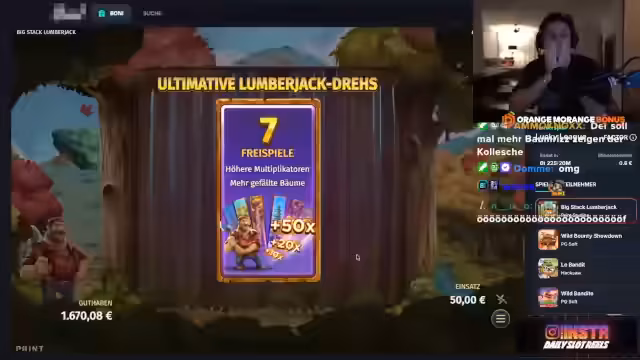 01:26:43Der Streamer führt das Spiel „Lumberjack“ ein und fragt die Zuschauer, wer gestern dabei war, um das Spiel zu erklären. Er beschreibt, wie sie gestern auf 50 Euro gespinnt haben und Freispiele im Wert von 4.250 Euro kaufen konnten, die jedoch nur durch Spins ausgelöst werden. Er erklärt den Mechanismus des Spiels, bei dem ein Baum wächst und von einem übergewichtigen Axtschwinger gefällt werden kann, wenn er seine maximale Größe erreicht hat und goldene Äxte gesammelt wurden. Gestern wurden 18.000 Euro Balance verloren, ohne die Superfreispiele auszulösen. Er hofft auf normale Freispiele oder goldene Äxte, um den Baum zu fällen und die Superfreispiele zu aktivieren. Die Slot schuldet ihnen nach seiner Rechnung bereits 19.000 Euro.