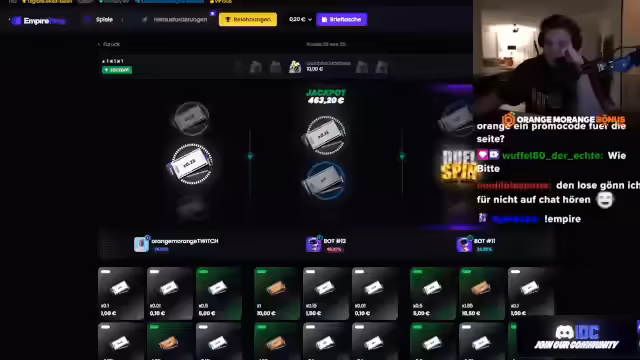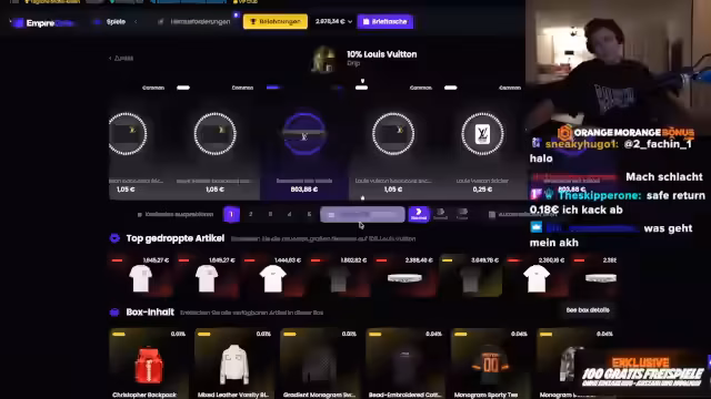 02:00:04Der Streamer wechselt zu Empire Drop und erklärt die Funktionsweise der Case-Opening-Seite. Er betont, dass es sich um sein eigenes Geld handelt und erklärt, dass man mit verschiedenen Zahlungsmethoden wie Kreditkarte, Apple Pay, Ethereum, Bitcoins, S-Skins und Dota-Skins einzahlen kann. Er beschreibt die Seite als eine „Sparseite“, bei der man Kisten öffnet, um Real-Life-Items zu gewinnen, die mit Gambling fusioniert sind. Er öffnet mehrere 10%-Cases, die jeweils 34 Euro kosten und eine 10%-Chance auf „Fat Profit“ bieten. Nach anfänglichen Verlusten und dem Ziehen von „Müll-Items“ wie einer Maus, erklärt er, dass man die gewonnenen Items entweder zugeschickt bekommen oder den Wert in Krypto auszahlen lassen kann. Er entscheidet sich, die Items auf „Upgrade“ zu setzen, um ein anderes Item zu gewinnen, was jedoch ebenfalls fehlschlägt. Er kämpft sich auf 4.400 Euro hoch und entscheidet sich für einen „Duellspin“, eine 50-50 Chance auf einen „Riesenhead oder Nichts“.