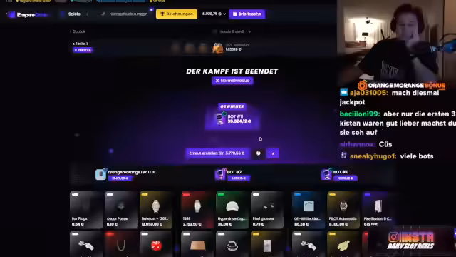 02:17:33Nach dem Gewinn von 30.000 Euro überlegt der Streamer, ob er das Geld auszahlen soll, da es ein „potenzielles Cashout“ ist. Er stellt fest, dass der effektive Gewinn nach Abzug der verlorenen 10.000er Bullet bei etwa 6.000 Euro liegt. Er entscheidet sich gegen ein Verdoppeln auf 60.000 Euro, da die Chance zu gering ist, und wählt stattdessen eine 50-50 Chance auf 30.000 Euro, die er erfolgreich meistert. Er ist begeistert von dem Gewinn und überlegt, sich ein Motorrad, das er gezogen hat, zuschicken zu lassen, entscheidet sich aber für eine Krypto-Auszahlung. Er rechnet seine bisherigen Einzahlungen bei Empire seit dem 7. November hoch und stellt fest, dass er trotz des großen Gewinns immer noch leicht im Minus ist. Er versucht sich an weiteren Case Openings, darunter „Multiplier Madness“ und „Crazy Jackpot“, um seine Verluste auszugleichen und beweist seinem Chat, dass er Recht hatte, indem er trotz der Bedenken des Chats gewinnt. Er bewirbt den Code „Orange im Orange“ für Empire, der 200% Bonus auf die erste Einzahlung bietet.