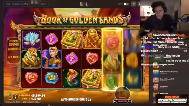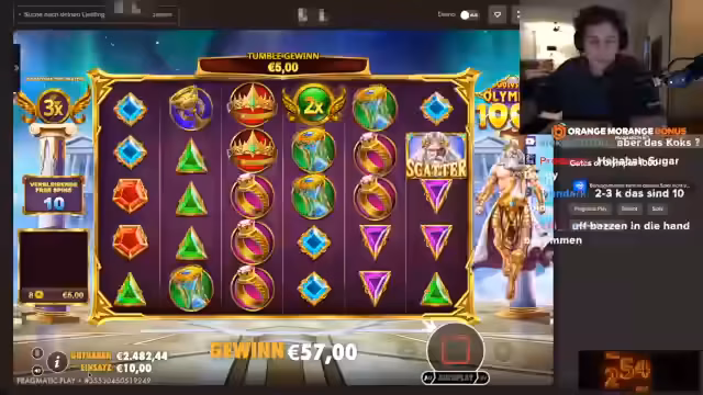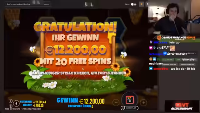01:36:42Als besonderes Giveaway für die Community kauft Orange Morange Freispiele in einem Wert von insgesamt 10.000 Euro. Die Zuschauer hatten im Chat die Möglichkeit, ihren Lieblings-Slot nennen. Für jeden ausgewählten Nutzer kauft der Streamer im Wert von 1000 Euro Freispiele, die nacheinander im Stream aufgedeckt werden, um einem Community-Mitglied einen großen Gewinn zu bescheren.