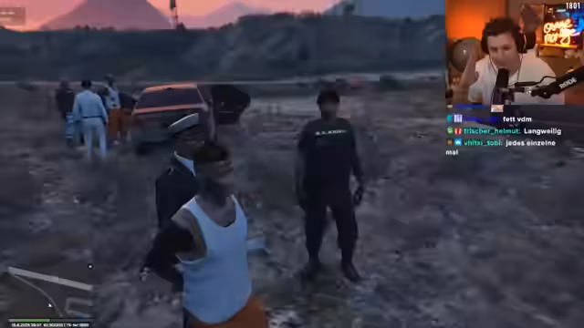 01:24:20Vom Streamer ausgerufen, fordert der Chat die Truppe auf, ihn aus dem Gefängnis zu retten. Währenddessen bricht ein weiterer Spieler im Hof zusammen. Die Army kümmert sich um den Verletzten, während der Streamer einen Armee-Offizier um Hilfe bittet. Anschließend versucht er, mit einem Verbandskasten ausgerüstet, aus dem Gefängnis zu fliehen.