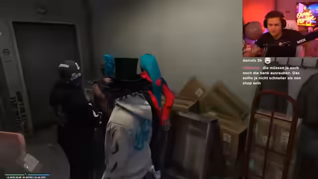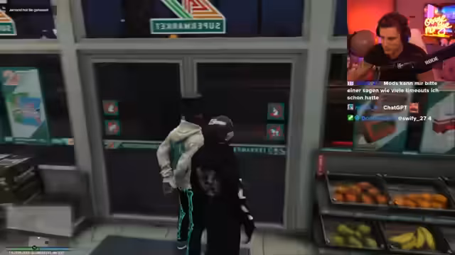 01:57:29Der Streamer beginnt ein Rollenspiel, in dem er einem neu angekommenen Spieler namens Lail Sula das Leben im GVMP erklärt. Er schenkt ihm 200.000 Dollar und nimmt ihn unter seine Fittiche, um ihn in die Welt des Untergrunds einzuweisen. Die erste "Lektion" besteht darin, einen Supermarkt auszurauben, während die Polizei beschäftigt ist (Staatsbank). Der Streamer gibt detaillierte Anweisungen, wie man eine Geiselnahme durchführt und wie man sich verhält, um erfolgreich zu fliehen.