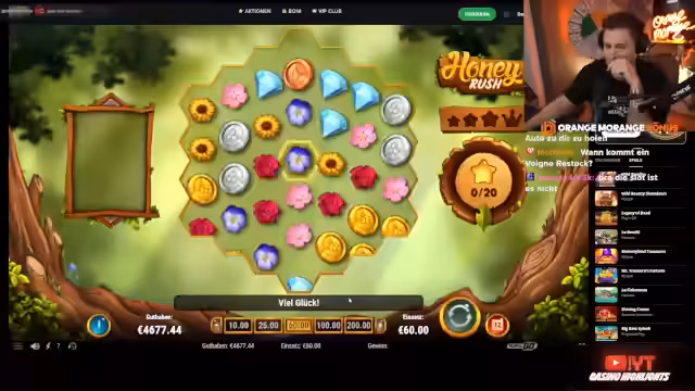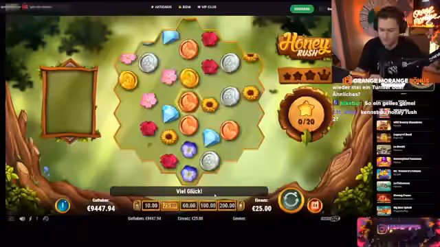 00:19:37Nach einer Unterbrechung wegen technischer Probleme wechselt der Streamer vom Spiel Lex zu Honey Rush. Er beschreibt das Spiel als eine Legende, die lange nicht gespielt wurde, und erwähnt die beruhigende Musik. Allerdings warnt er vor dem hohen Verlustrisiko, da der Händler sehr viel Minus machen kann. Er beginnt mit einem geringen Einsatz von 25 Cent, um das Spiel aufzuwecken, und erläutert die Symbol-Hierarchie bis zur Bienenkönigin.