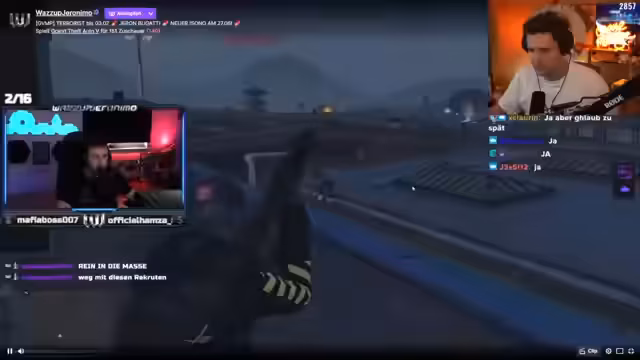 02:30:12Die Konfrontation verlagert sich zum Flughafen, wo sich die Spieler treffen, um einen Anzug auszurüsten. Es kommt zu einer Polizei-Verfolgungsjagd, als LSPD-Einheiten ankommen. Die Spieler versuchen, durch gezielte Schüsse und die Nutzung von Gelände am Hangar zu entkommen, während die Polizei die Westen und die Munition der Spieler aufbrauchen will. Die Situation bleibt angespannt und dynamisch.