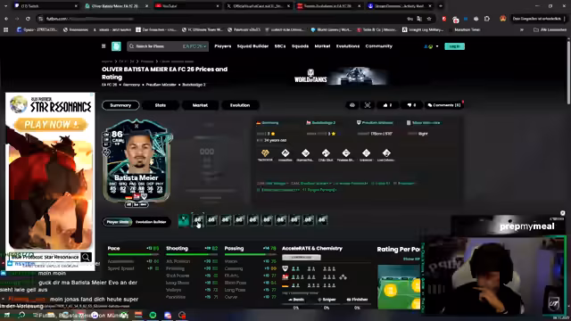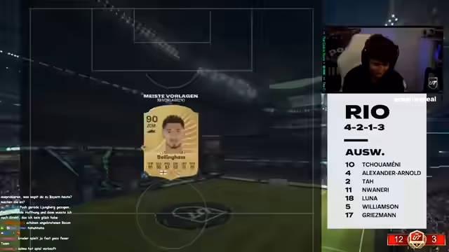 00:16:52Die Vorhersage des Bayern-PSG-Spiels wird als 'super schwer' bezeichnet. Es wird über Spieler wie Iniesta, Mbilli Scream und Futre diskutiert, wobei Mbilli Scream als 'beste RM-Karte' im Spiel gelobt wird. Die Cherki Evo und Greenwood Evo werden auf verschiedenen Accounts erwähnt. Die Wichtigkeit von Playstyles wie 'Low Driven' und 'Pass-Trade' wird betont. Es wird die aktuelle Aufstellung des Streamers als 4-1-4-1 beschrieben, die er seit anderthalb Wochen spielt. Messi Special Cut und Maradona werden als gute Optionen im Sturm genannt, wobei Pina Special Card als zu teuer für den aktuellen Markt angesehen wird, obwohl sie 'crazy' ist. Die Ladder-Dauer von nur einer Woche wird thematisiert.