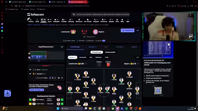01:21:07Der Streamer analysiert das Spiel zwischen Mainz und einer Jugendmannschaft und bespricht die Leistung von Kane, der ein Tor erzielt. Er kritisiert das Timing von Abspielen und die Absicht des Spielers, sich den Fans zu zeigen. Es wird auch die Weekend League erwähnt, wobei der Streamer angibt, hauptsächlich wegen seines Bayern-Teams daran teilzunehmen. Die Analyse zeigt sein tiefes Verständnis für die taktischen Aspekte des Spiels und die individuellen Leistungen der Spieler.