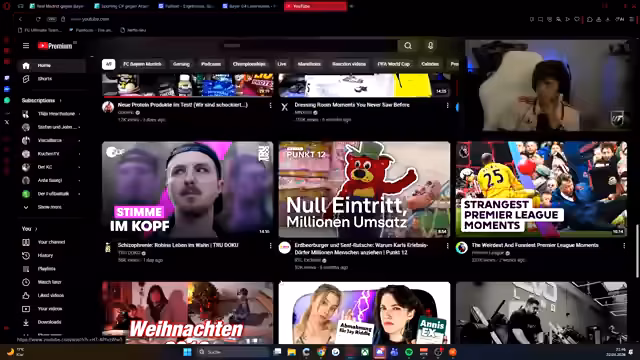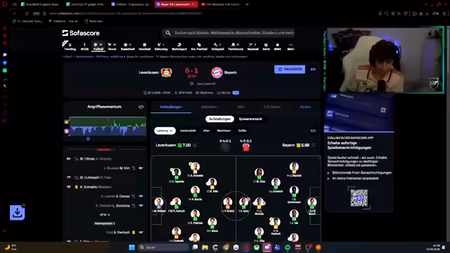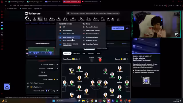 00:03:09Der Streamer zeigt große Vorfreude auf das Spiel zwischen Bayern und Leverkusen, das er als sehr geiles Matchup bezeichnet. Er erwähnt, dass er die Übertragung parallel anschauen wird und bittet um eine Aufstellung der Teams. Er stellt fest, dass Oliver Schmidt online ist und diskutiert über andere laufende Fußballspiele, darunter ein Spiel von Atletico Madrid mit einer roten Karte. Er erwägt, gleichzeitig Bayern auf ZDF und City auf Sky zu schauen, falls beide Spiele gleichzeitig stattfinden. Er äußert sich auch verwundert über das Spiel von Paris unter der Woche und hofft, dass sie dadurch kein Spiel am Wochenende haben.