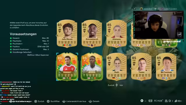 02:12:42In diesem Abschnitt diskutiert der Streamer intensiv die Evolutions (Evos) in FIFA Ultimate Team. Er bespricht spezifische Karten wie Pogba, Madden und Paketta, deren Stat-Updates (z.B. Pogba auf 88 Pace) und die Qualität der Evos. Es geht um die Limitierung auf einmalige Evolutions und die Schwierigkeit, sich zwischen verschiedenen Optionen zu entscheiden, während Madden als perfekter Ersatz für eine bestimmte Position hervorgehoben wird.