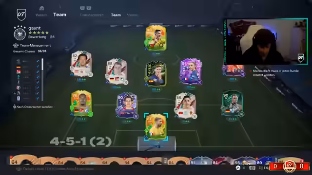 00:00:37Der Stream konzentriert sich auf FIFA Gauntlet, wobei der Streamer über frustrierende Spielerfahrungen spricht. Er beklagt die unfairen Matchups und die schlechte Spielmechanik, insbesondere gegen Teams mit Spielern wie Henderson und Di Maria. Der Ton ist geprägt von Ärger und Resignation, da er oft spürbare Nachteile gegenüber dem Gegner erlebt. Er äußert sich desillusioniert über den Meta des Spiels, der aus seiner Sicht nur aus „Bullshit“ besteht und das Spiel kein Vergnügen mehr macht.