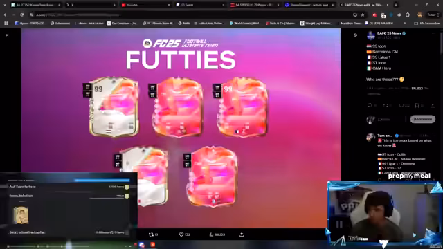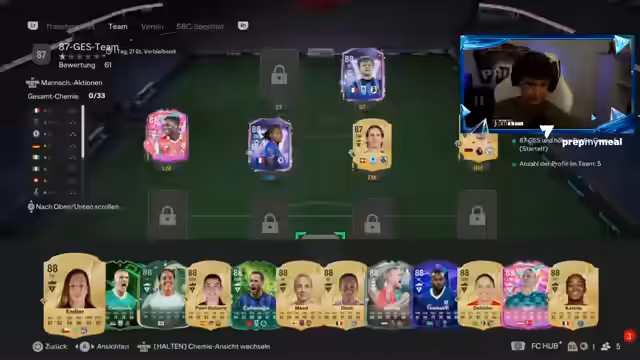 00:01:05Der Stream beginnt mit Diskussionen über FIFA 26. Es werden Erwartungen an neue Spieler geäußert, wie Luis, der auf 10 Scorer-Tore in der Saison getippt wird. Auch auf Karten von Haluba und Kim wird eingegangen, wobei Letzterer als komplex in FIFA beschrieben wird. Zudem wird eine Pack-Öffnung erwähnt, bei der Booty's Team 3-Pack als Basis für einen Trade dient und eine Archiv-Karte von Ribéry thematisiert wird.