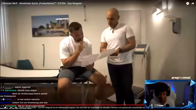05:04:13Der Streamer beginnt ein vierwöchiges Experiment mit dem Proteinfasten-Konzept von Christian Wolf. Er konsumiert dafür Shakes, ersetzt Zucker durch Süßstoffe und hat nur ein 8-Stunden-Fenster zum Essen. Sein Ziel ist es, Gewicht zu verlieren, ohne Muskelmasse zu verlieren. Der Reporter, Sascha Winkel, kritisiert die hohen Kosten der Produkte und vergleicht die Preise mit günstigeren Mitbewerbern, während auch Mediziner vor den gesundheitlichen Risiken eines übermäßigen Protein- und Süßstoff-Konsums warnen.
